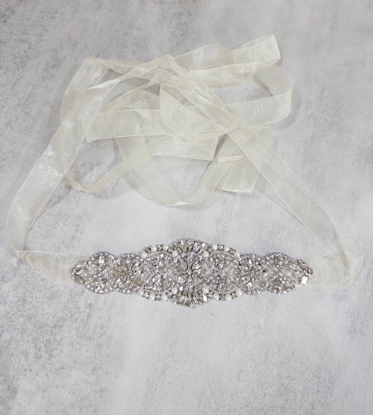 "Lily"Rhinestone Crystal Pearl Belt W/ Silver Ivory Organza